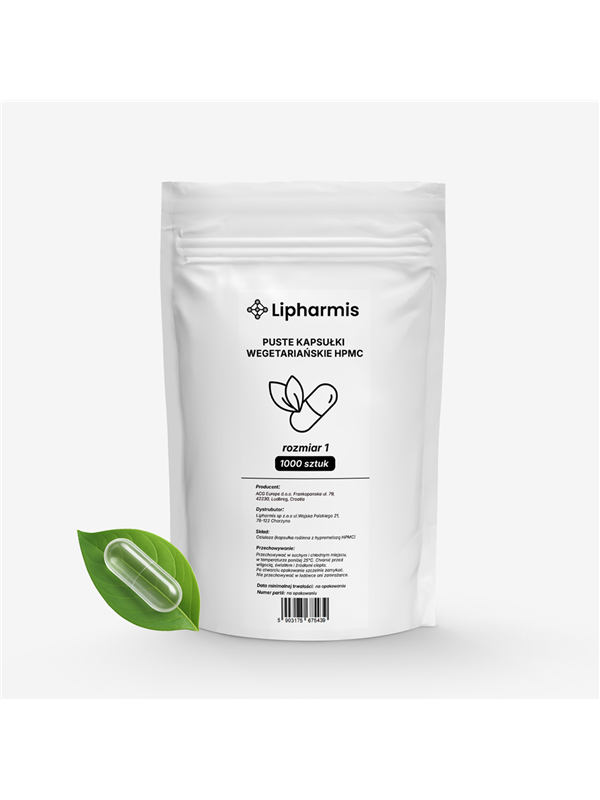 Bezbarwne kapsułki wegetariańskie HPMC, rozmiar 1 do samodzielnego napełniania proszkami, ziołami, witaminami i minerałami. 100% czyste, bezpieczne i wolne od konserwantów oraz barwników. Nie nadają się do płynów ani materiałów wilgotnych. Producent: ACG Europe d.o.o., Chorwacja.